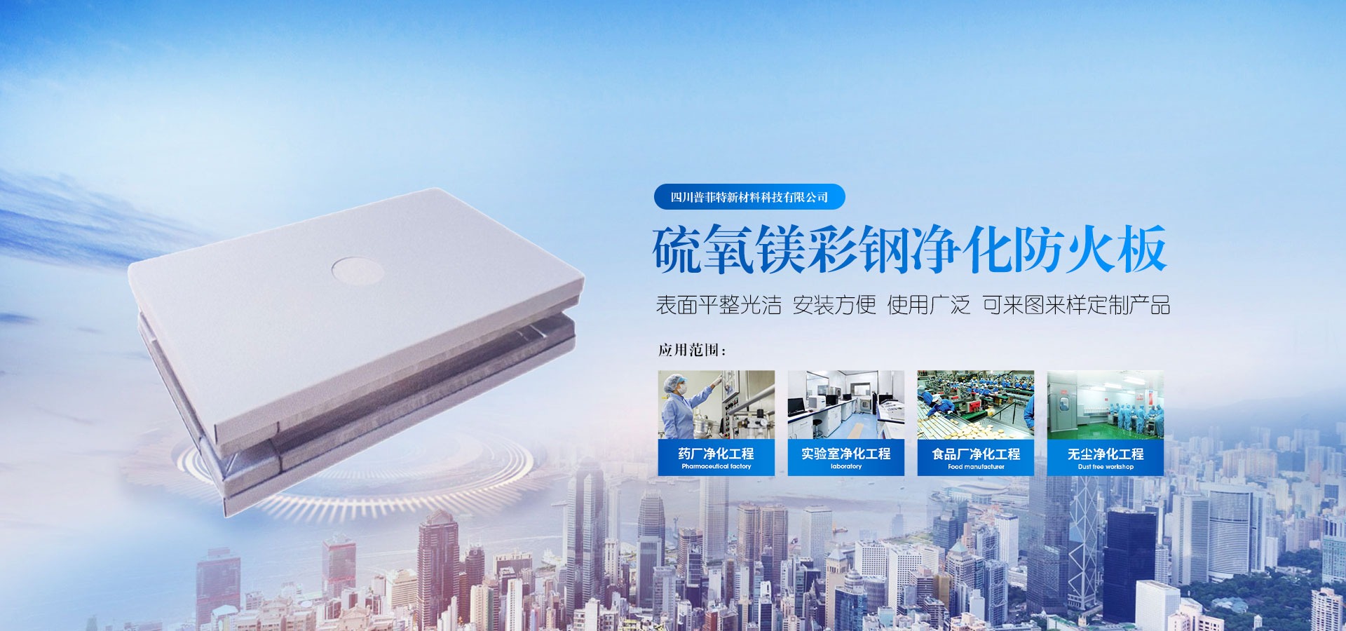 四川普菲特新材料科技有限公司,根據潔凈室彩鋼板防火要求,研制生產的硫氧鎂彩鋼防火板。它是以綠色環保建材為主體, 經特殊的生產工藝,科學的安裝接點而成的,新穎潔凈室墻體材料。